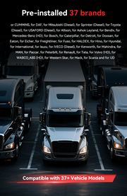 Pre-installed with diagnostic coverage for 37 major heavy-duty brands, including Cummins, DAF, Freightliner, Volvo HD, Mack, Peterbilt, Kenworth, and Mercedes-Benz HD. Additional brand libraries can be added through optional software extensions.